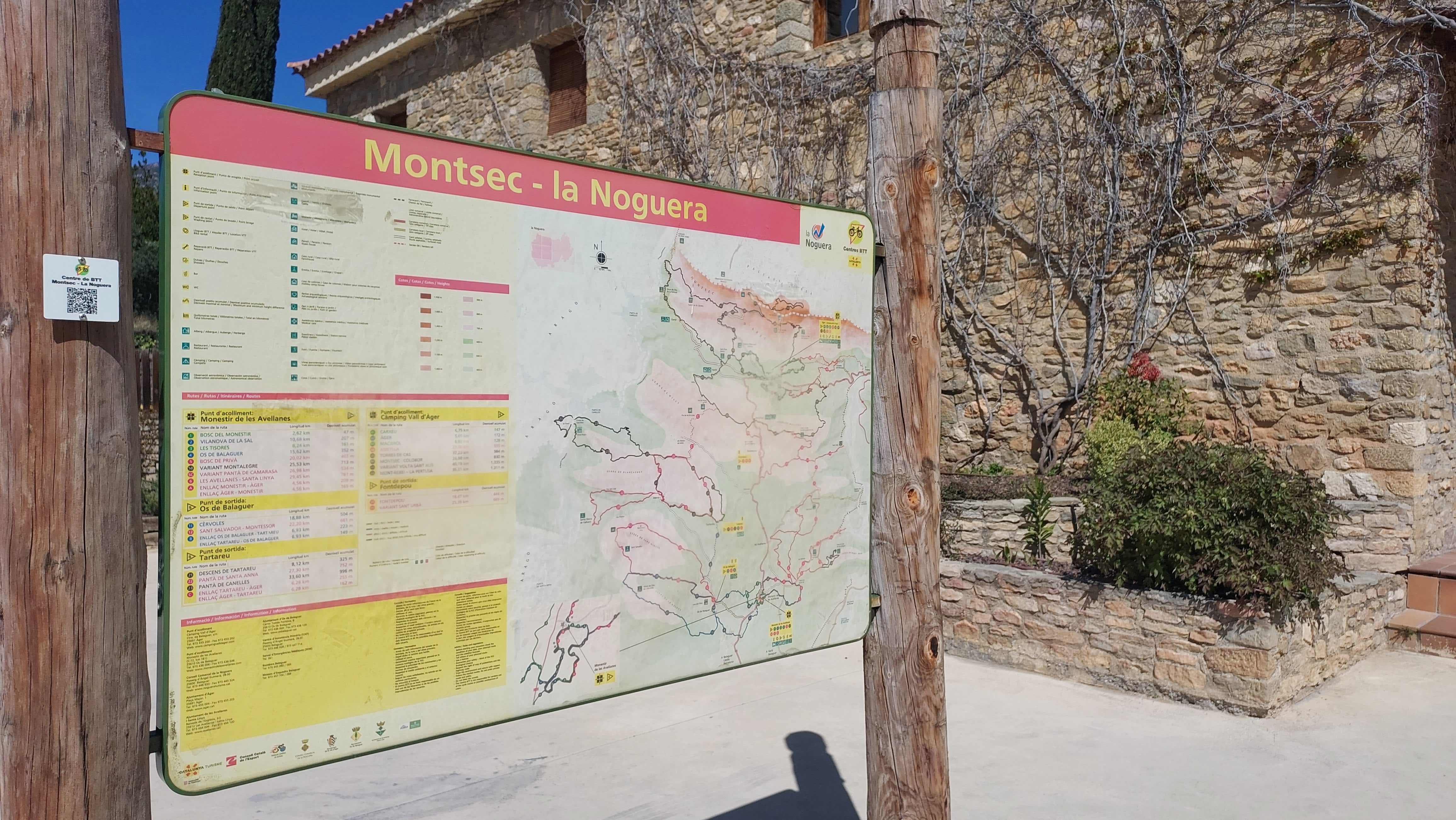 En segon lloc, es va realitzar senyalització sobre el terreny, no calia una gran inversió de pals de fusta i xapes de ferro, sino al contrari, es va instal.lar unes petites xapes vinilitzades amb un codi QR que apunta a Wikiloc, aquestes es van clavar al centre d’Acollida del Monestir de les Avellanes, al centre d’acollida del Càmping Vall d’Àger i, als altres punts de sortida com són Os de Balaguer, Tartareu i Fontdepou. I en tercer lloc, es van produir 5 metacrilats de sobre taula amb els codis QR implementats, els quals es van ubicar a les recepcions del Monestir de les Avellanes i del càmping Vall d’Ager, a l’Ajuntament de les Avellanes i Santa Linya, a l’Ajuntament d’Os de Balaguer i l’Ajuntament d’Àger.